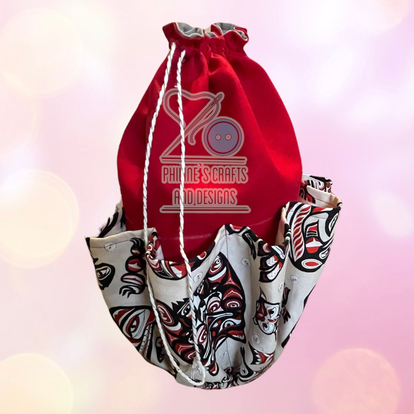 Bingo bag to hold all your bingo needs. Can hold up to 6 bingo daubers. With a draw string close.